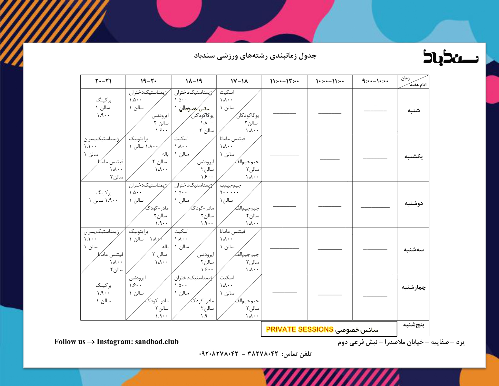 جدول برنامه و تعرفه کلاس‌ها – تابستان ۱۴۰۴